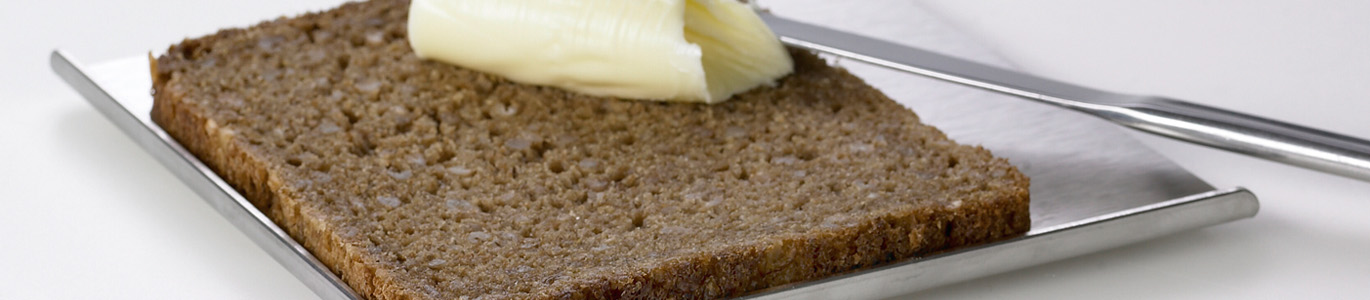 Enhåndsbetjent smørebrik med gribekant, der holder brødet på plads. I et flot tidssvarende design, der både er smukt at se på og meget funktionelt.